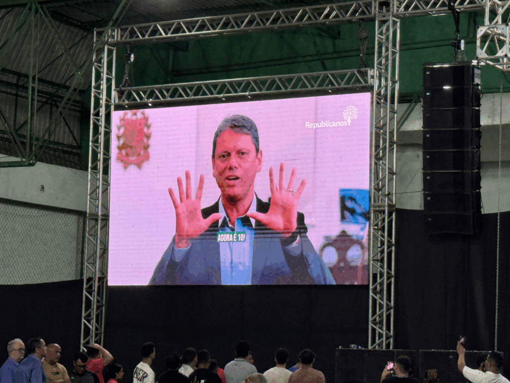 O governador de São Paulo, Tarcísio de Freitas (Republicanos), participou por vídeo, assim como os senadores Cleitinho Azevedo, Jorge Seif, Marcos Rogério e o deputado federal Celso Russomano.